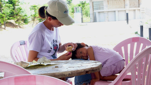 第二站中屯風車,這風車其實就是風力發電,他是全台灣第二座風力發電,供應全澎湖7%的電力,我們並沒有參觀太久,因為旁邊攤販賣的飲料比在大太陽底下看風車來的有興趣,買了風茹茶很清涼,但是不夠退火,這時候我們看到了台灣人的驕傲,他的名字叫比爾,全名是台灣比爾,小名金牌,當場買了幾罐現場喝,幾罐放座墊,這張照片是老闆娘以及她的可愛女兒,這邊我要澄清"我不是羅莉控"。