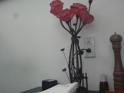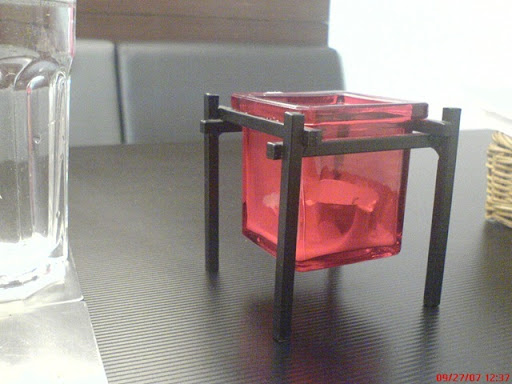 服務生把我們帶到用餐的位置,桌上擺著一個小蠟燭(右圖),晚上才會點,桌旁是玫瑰花燈,可以想像這邊夜晚應該更美麗。