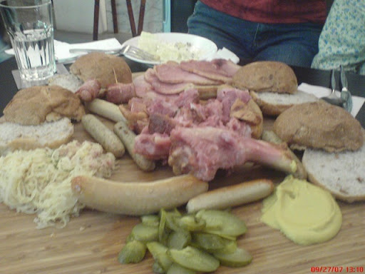 ,裡面有萵苣、烤過的乾麵包、小葡萄乾,裡面我最喜歡的是烤過的乾麵包,又香又脆,不過乾麵包有點少,小可惜。這個"鹹"起司粉,同事都說太鹹了,我是比較重口味,所以這個蠻符合我的味蕾的。我給90分。接著來的是重頭戲,一拿上桌真的嚇了我一跳,一個大圓形的砧板,上面放著各式各樣的主食,很像一個豬肉攤販,而我是這個攤販的老闆,上面好多根不知名的德國香腸,都不同口味,我很難做出評論,因為我吃過的德國香腸不多,不過我覺得還不錯吃。旁邊有黃芥末、酸黃瓜、細絲酸菜,拿來搭配德國豬腳,另外有四塊麵包可以夾德國豬腳,豬腳的部分已經都處理好了,只要拿叉子把一塊一塊的豬腳放進嘴裡,他有處理成片狀和塊狀,片狀的可以拿來夾麵包,看似肥肉很多,可是吃完後一點都不會覺得油膩,看來師傅有做去油的處理。塊狀的口感很好,味道香,搭配旁邊的酸黃瓜真是太美味、太銷魂了,另外細絲酸菜我覺得還好,沒有很喜歡它的味道,要酸不酸,而且又沒甚麼味道,不知道要搭配甚麼。黃芥末沾塊狀的豬腳也很正點,但是不要沾太多,會把味道搶走,這道主菜不管麵包還是豬腳都很和我胃口,我給93分。飲料我點的是柳橙汁,普普通通,75分。甜點點個特別又沒吃過的啤酒凍,吃到口中,很不習慣的味道,濃厚的麥味,帶有一點酸澀,不是很喜歡,我給78分,不甘心,我就偷挖同事的奶酪,好吃!!!!!!蠻濃的奶香,搭配上面的果醬,會想再吃的好物。