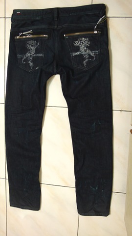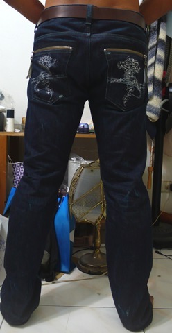 一看到這件就被他的後口袋所吸引,"雙龍搶珠",而且有拉鍊。這不正是我喜歡的型嗎!!!!!櫃員說有我的size,二話不說馬上拿來試穿,這件的褲型是我想嘗試的低腰小直筒,刷色就比較低調,不太會形容,就看圖吧。我的大腿很粗,但是這件褲子的剪裁修飾了,加上他是深色,視覺上的修飾也不少,套上這件就不想脫下他,那就......就乖乖的帶走他吧。