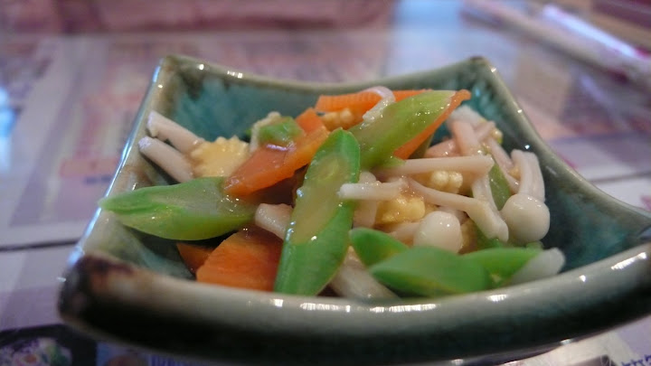 在口味的部分,先來講泡菜,薑味有點過重,辣的程度也不夠,不是很喜歡,再來是那小盤凉拌,裡面是金針菇、豆豆、紅蘿蔔拌味噌,味道稍甜,沒有特別的感覺,阿花不喜歡吃,幾乎整盤都是我吃的,感覺有點噁。阿花說:味道很不搭....不喜歡!